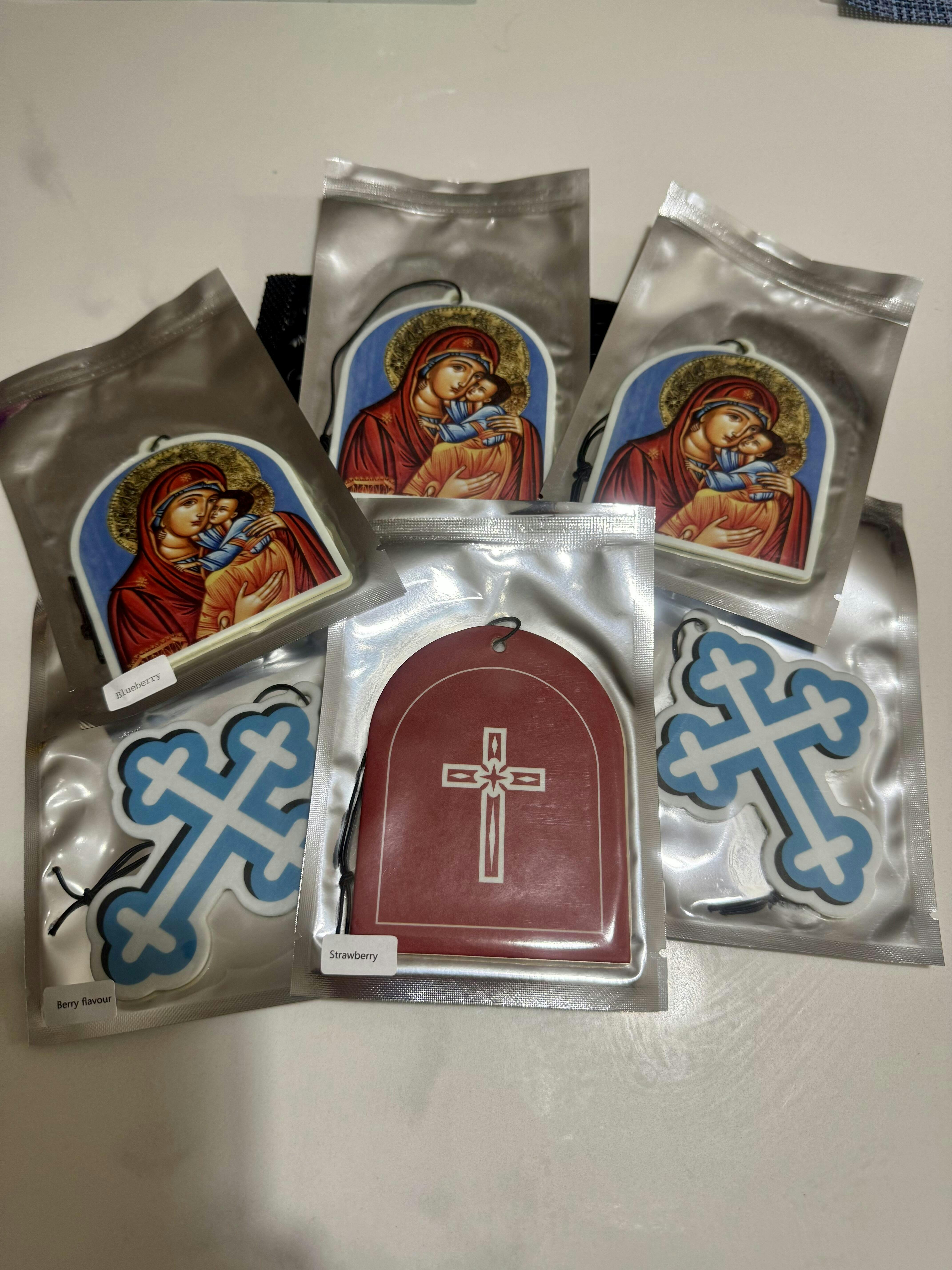A tender depiction of grace and compassion, the Mother Mary air freshener features a radiant icon of the Theotokos cradling the Christ Child. Her serene gaze and gentle embrace symbolise divine protection, unconditional love, and unwavering faith.